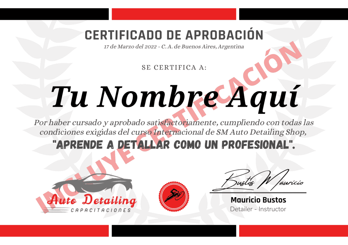Con este curso podrás obtener el certificado / diploma avalado por SM Auto Detailing Shop. El mismo se puede emitir a nombre tuyo o de tu negocio.