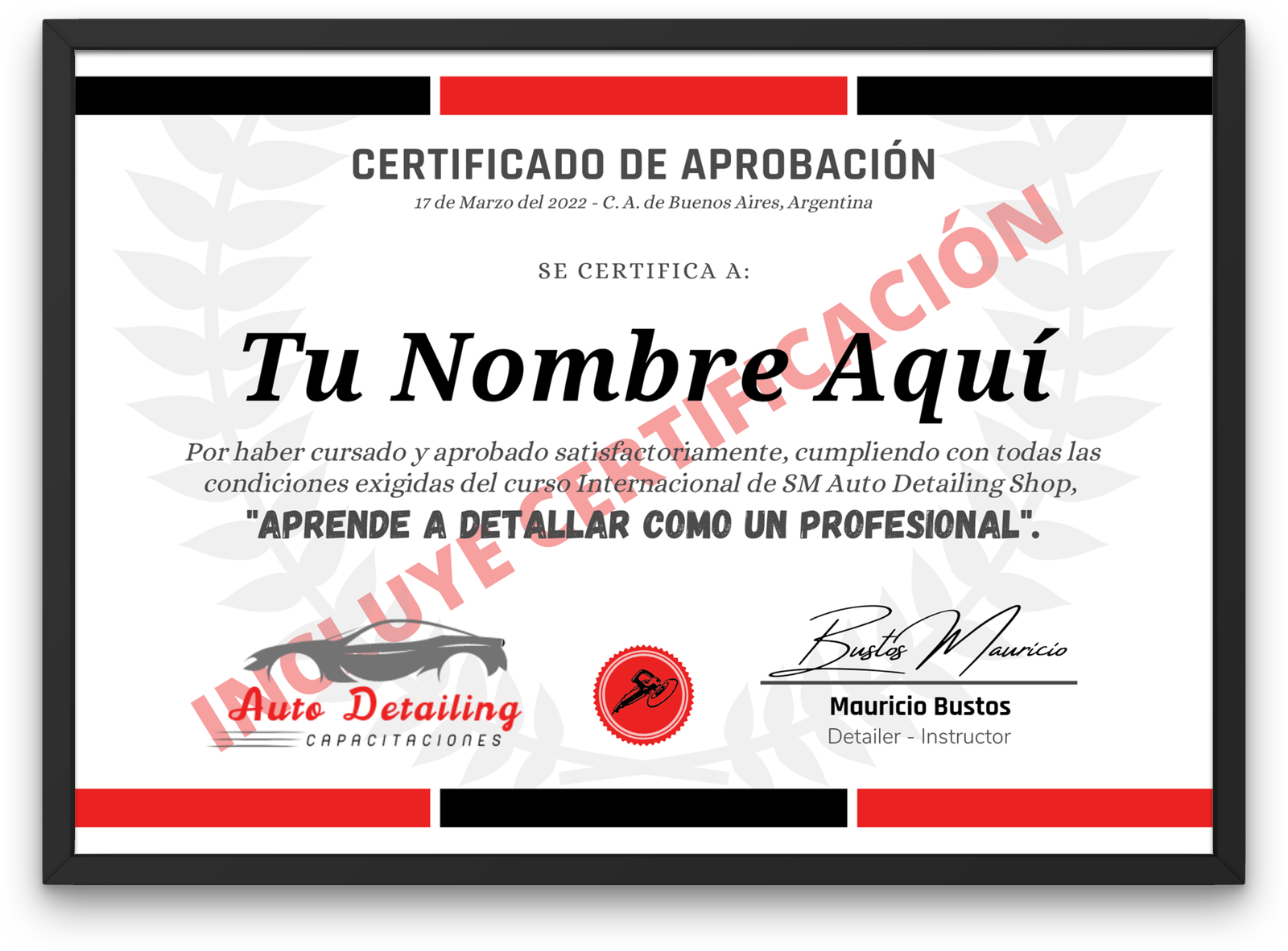 Obtén tu certificado, imprímelo, ponle un marco y quedara listo para exhibir en tu taller de Detailing